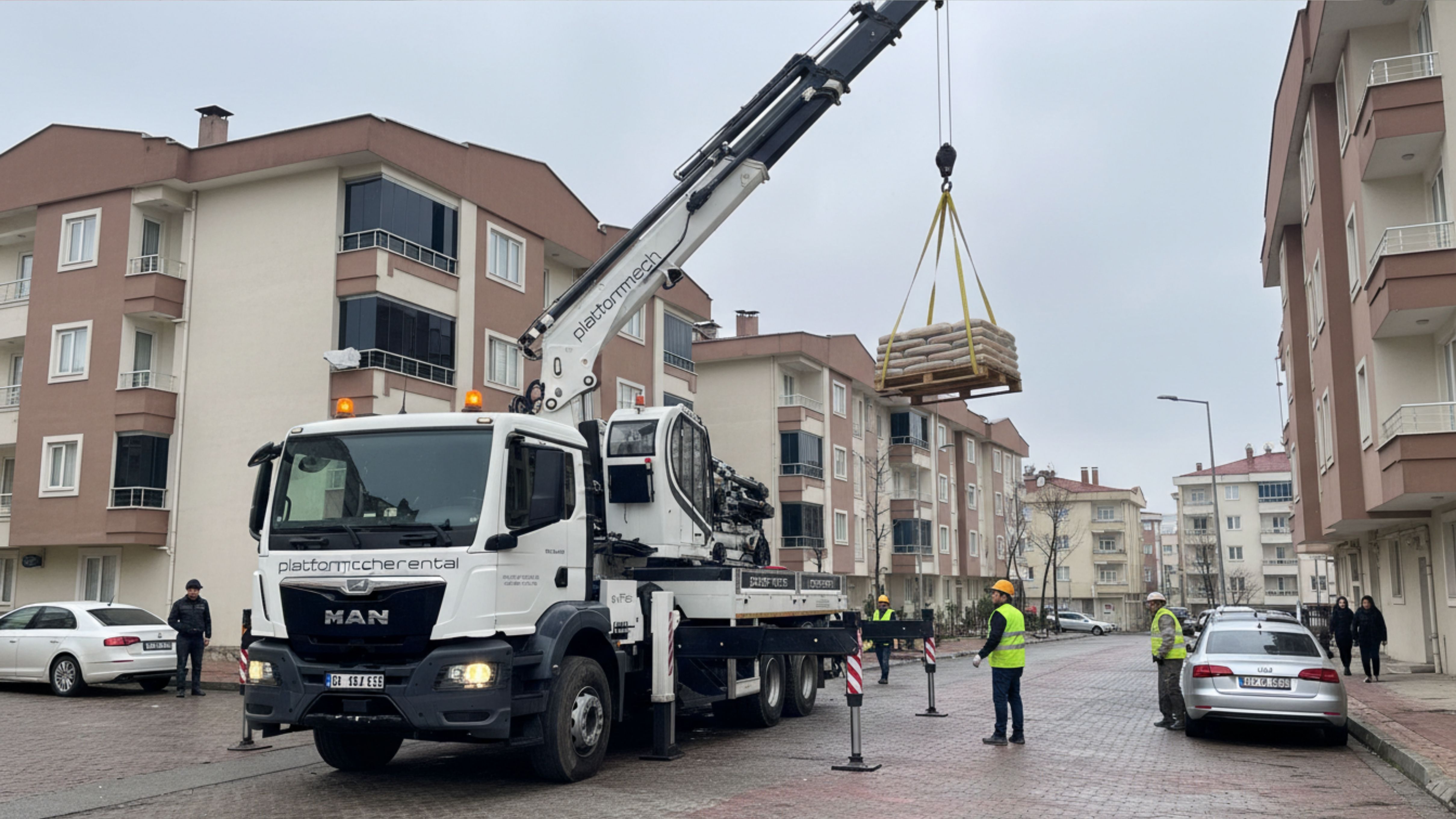 Moloz Atımı: Tadilat sonrası çıkan moloz çuvallarını, katlardan aşağı indirmekle uğraşmadan, vinç sepetiyle kontrollü bir şekilde araca yüklüyoruz.