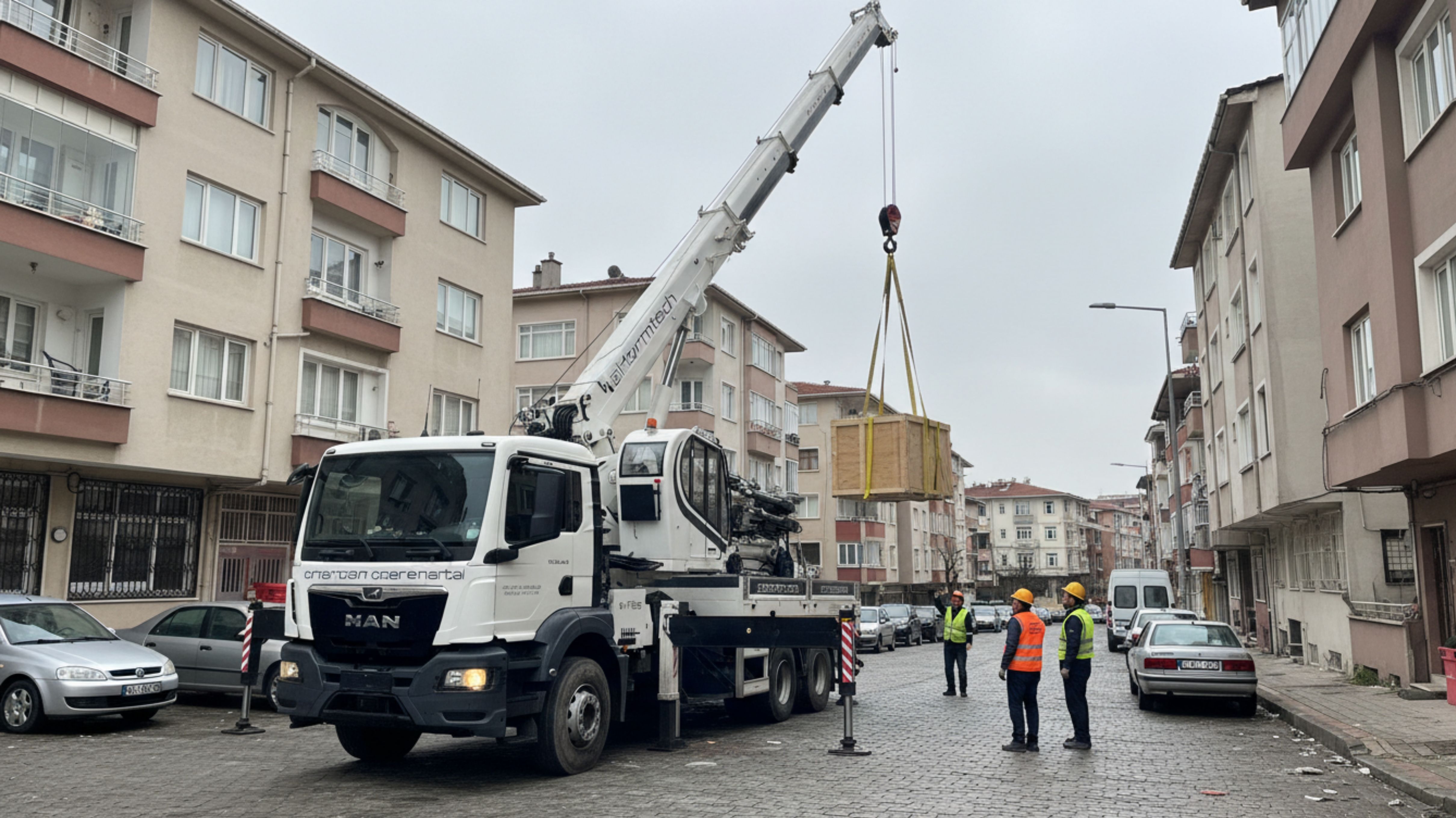 Kırmalı Vinç (Hiyap): Yunus Emre Mahallesi’nin sokak yapısına uygun, manevra kabiliyeti yüksek bu araçlarla; inşaat malzemesi, konteyner veya jeneratör gibi yükleri seri bir şekilde transfer ediyoruz.